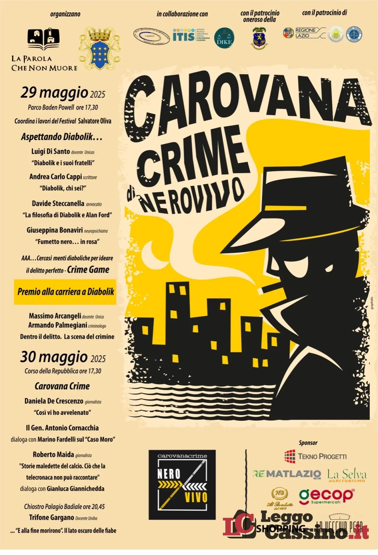 Due giorni di cronaca nera, street talk e il premio alla carriera per Diabolik Due giorni di street talk rapidi, incisivi, interattivi. Approfondimenti tematici su cronaca e attualità, una scena del crimine riprodotta fedelmente e basata su documenti inediti. NeroVivo Festival avrà la sua anteprima estiva a Cassino, il 29 maggio 2025 al Parco Baden Powell ed il 30 maggio sul Corso della Repubblica attraverso la Carovana Crime. Destinazione finale: il chiostro del Palagio Badiale.