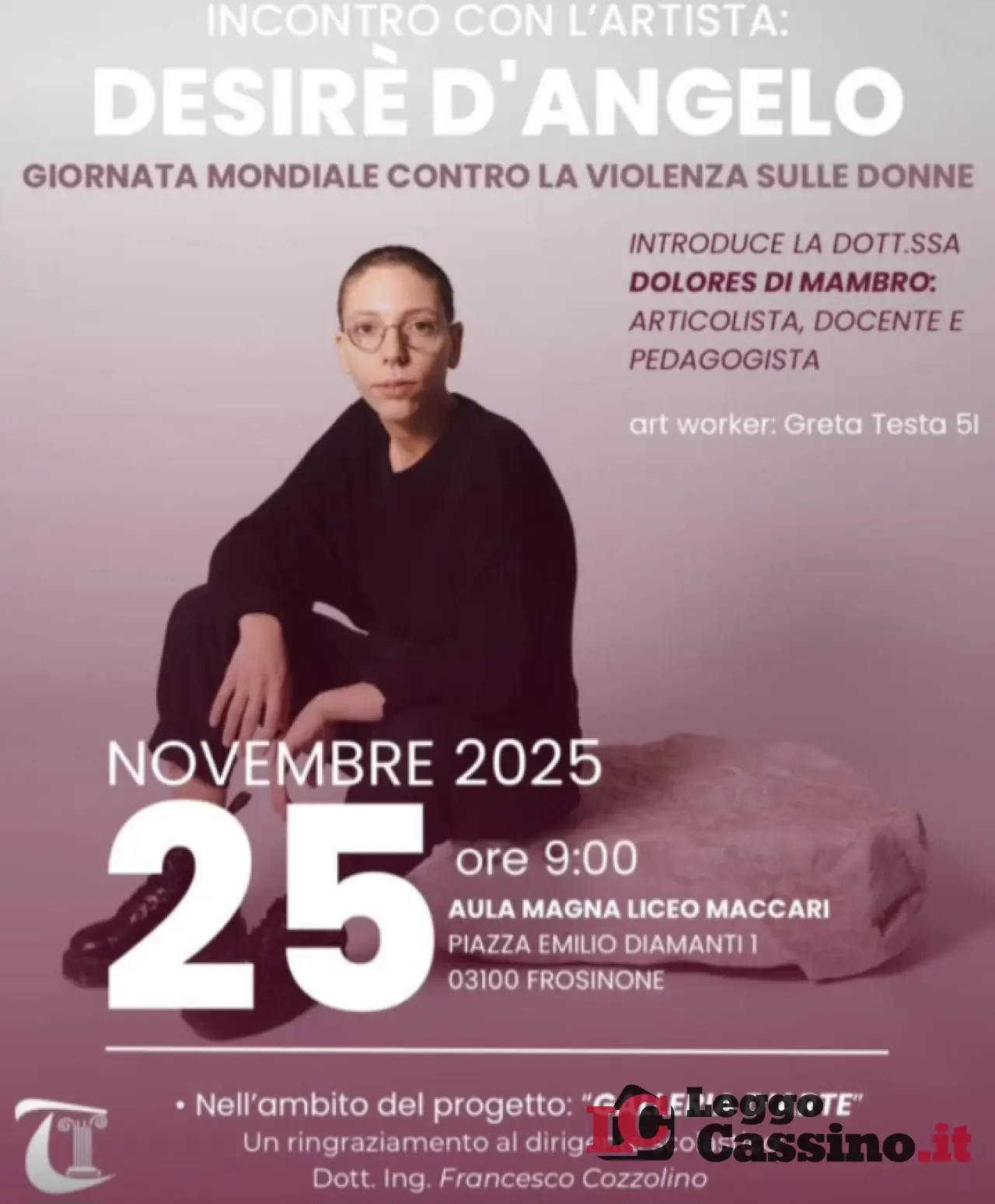 Nella giornata mondiale contro la violenza sulla donna, presso l’aula magna dell’istituto Maccari di Frosinone si è svolto un workshop speciale guidato dall’artista Desirè D’Angelo, che ha accompagnato gli studenti in un percorso creativo, artistico ed emotivo delicato al tema dell’identità in continua evoluzione dei ragazzi.
