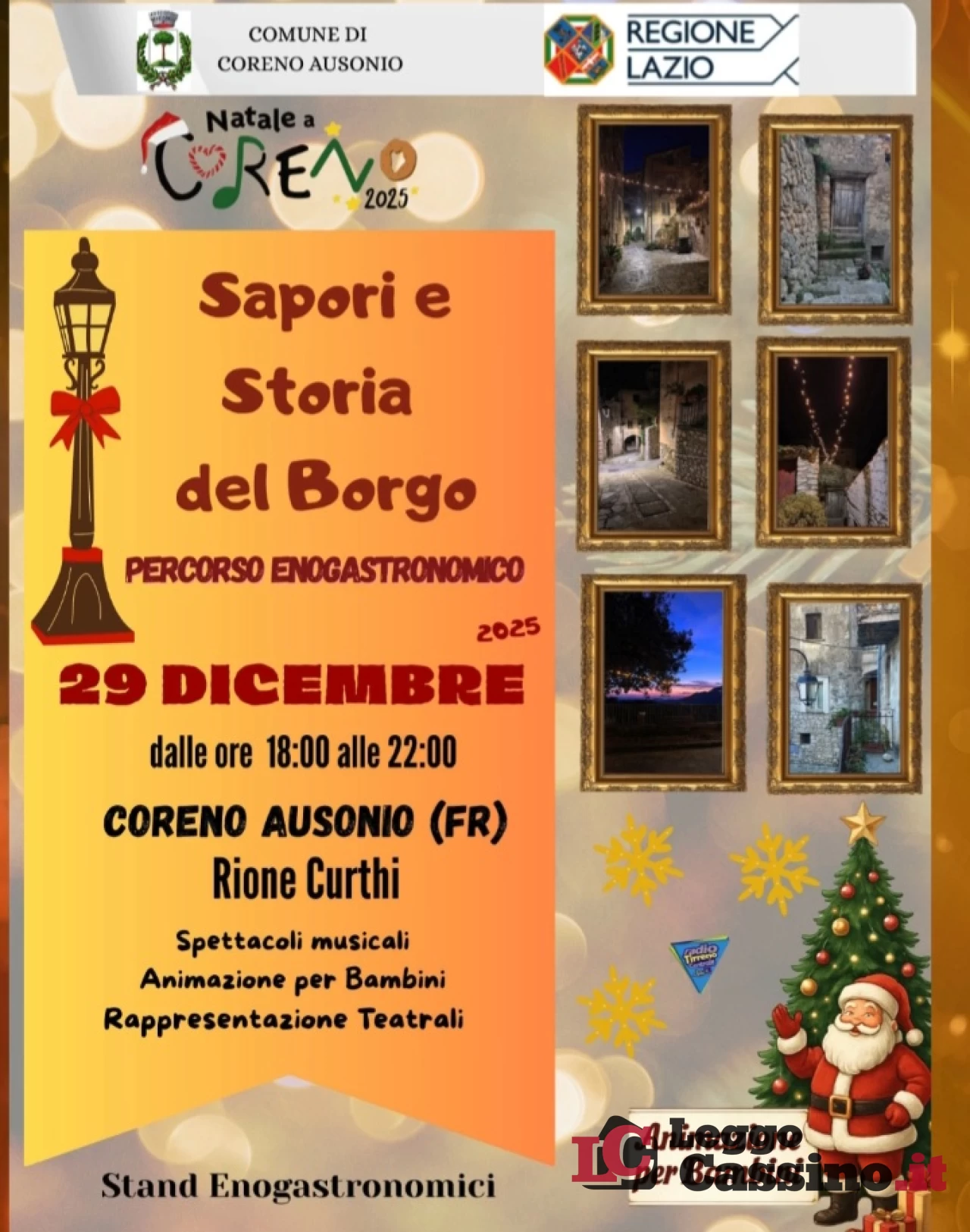 Si terrà oggi lunedì 29 dicembre a Coreno Ausonio “Sapori e storia del borgo” a partire dalle ore 18 in zona Curthi (centro storico). Spettacoli, animazione per bambini, rappresentazioni teatrale e percorso enogastronomico con prodotti tipici locali.