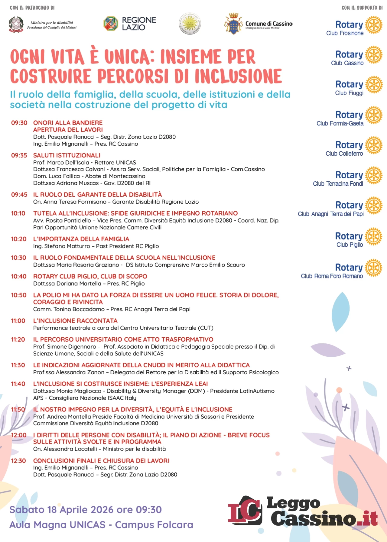Scuola e Università - Sabato 18 aprile, alle ore 9:30, l’Aula Magna dell’Università degli Studi di Cassino e del Lazio Meridionale ospiterà il convegno “Ogni vita è unica: insieme per costruire percorsi di inclusione”, promosso dai Rotary Club del Basso Lazio