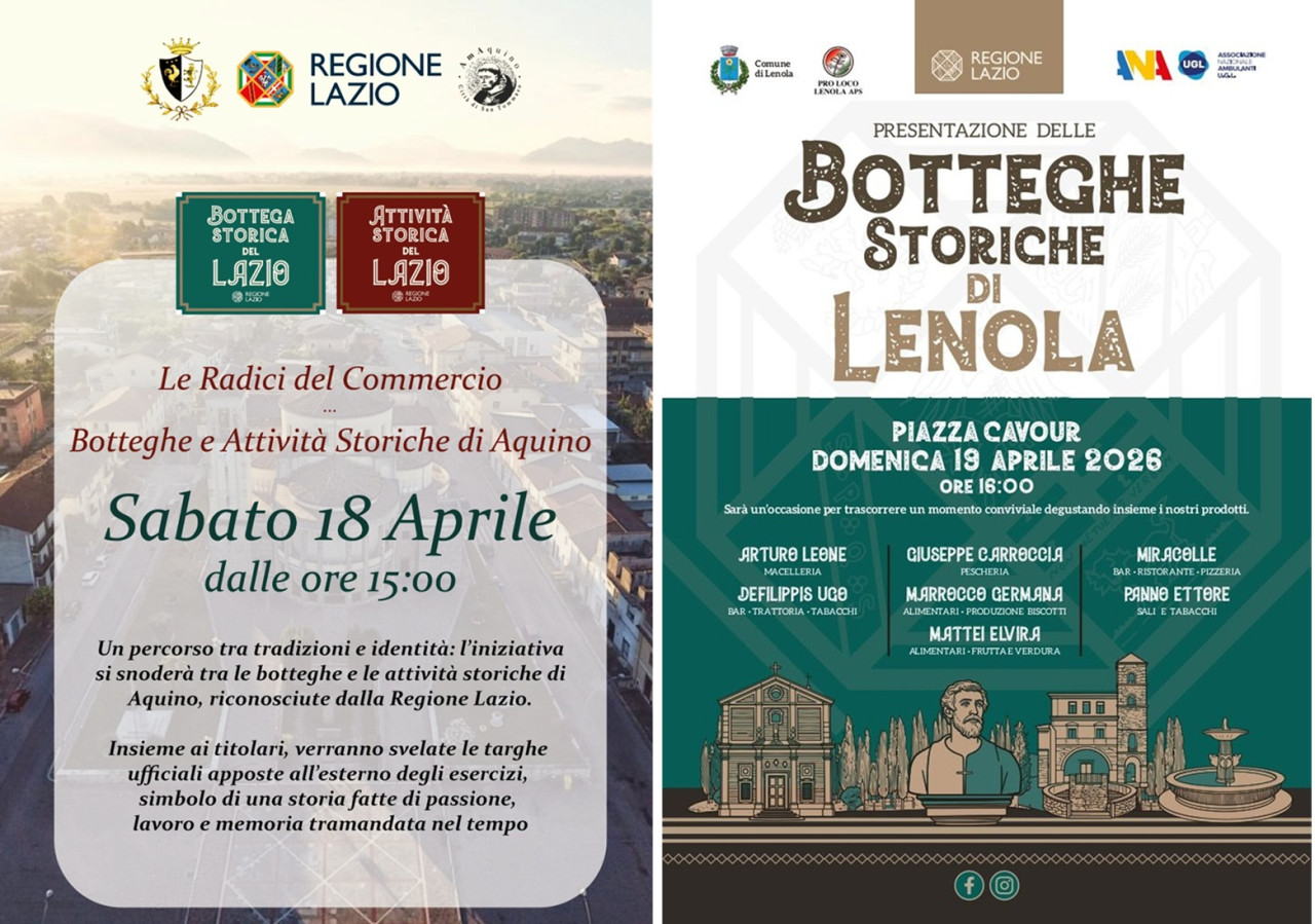 Ad Aquino, l’iniziativa "Le Radici del Commercio" vedrà le autorità cittadine impegnate in un percorso ideale tra le vie del centro. Insieme ai titolari, verranno svelate le targhe ufficiali della Regione Lazio affisse all’esterno dei locali: un simbolo tangibile di una storia fatta di passione e memoria tramandata nel tempo. L'elenco completo dei premiati e l'ordine delle visite saranno resi noti a breve dall'amministrazione e dalla Proloco locale.