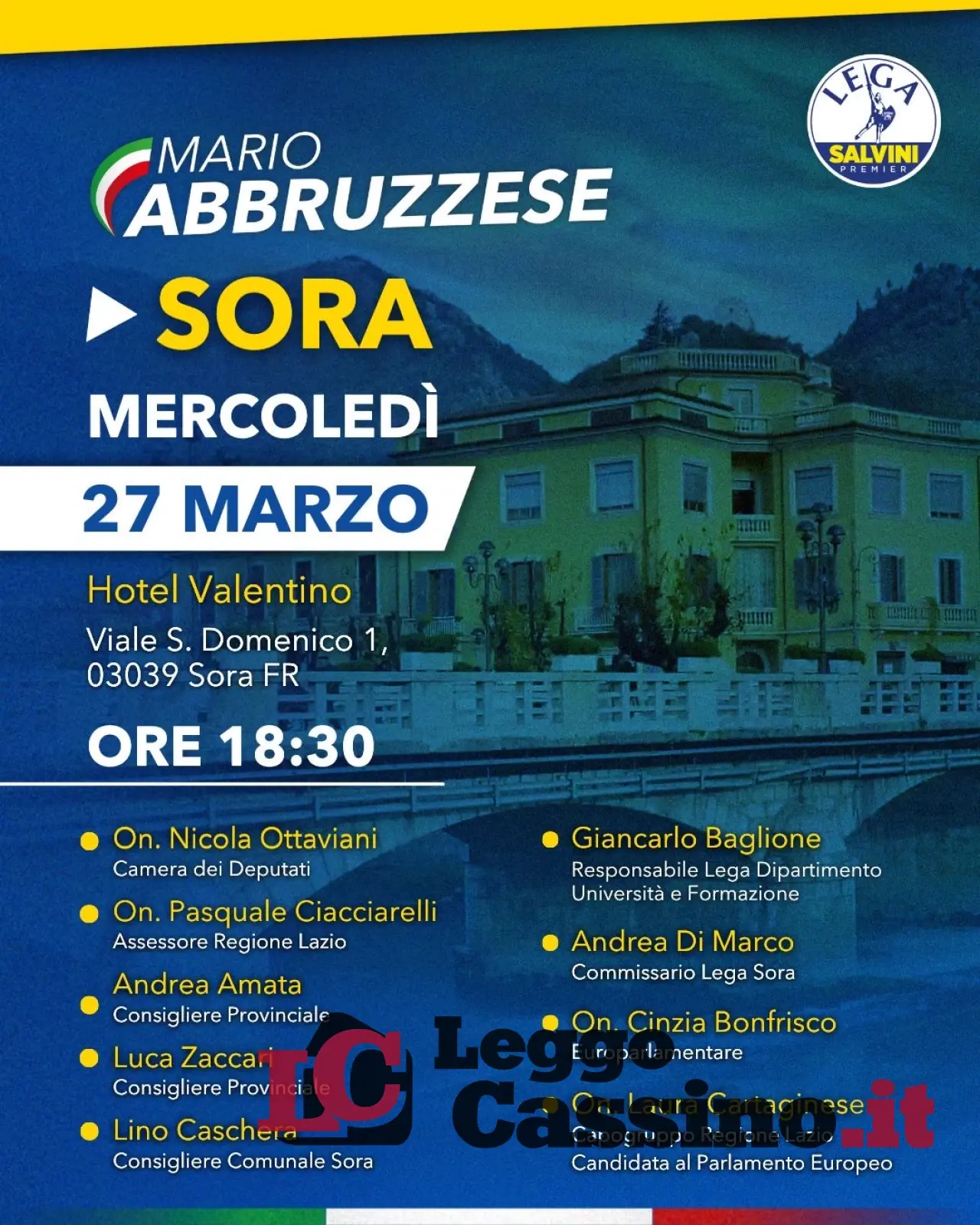 Prosegue con il vento in poppa il tour della Provincia di Frosinone del candidato alle Europee della Lega, Mario Abbruzzese. Dopo le grandi “kermesse” di Ferentino, Cassino, la tappa di oggi a Ceprano, domani 27 marzo alle ore 18,30, l’ex presidente del Consiglio Regionale sarà protagonista a Sora presso l’Hotel Valentino.