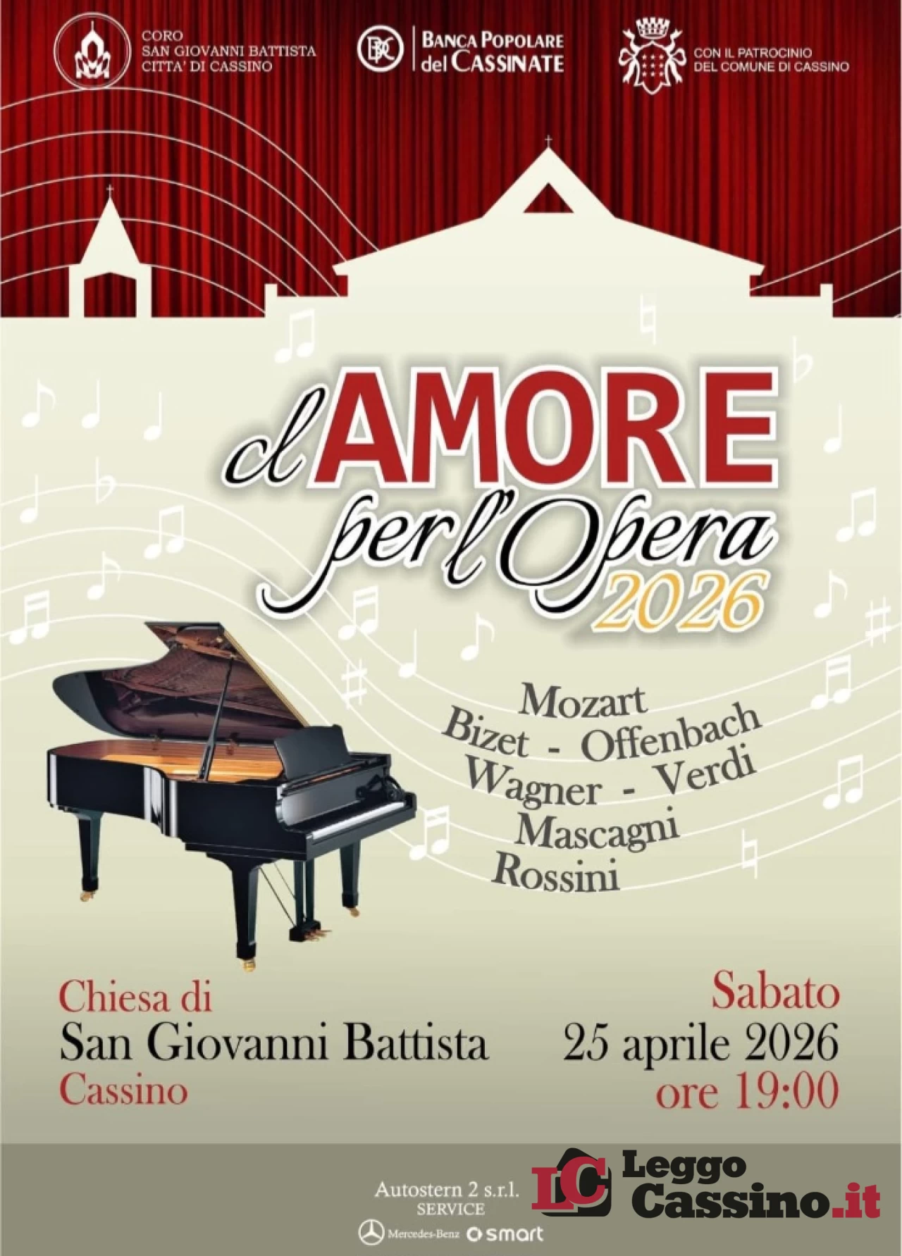 “clAmore per l’Opera 2026”, questo il titolo del concerto promosso dal Coro San Giovanni Battista Città di Cassino, diretto dal Maestro Fulvio Venditti, si terrà sabato 25 aprile 2026, alle ore 19:00, nella suggestiva cornice della Chiesa di San Giovanni Battista di Cassino, con il sostegno della Banca Popolare del Cassinate e il patrocinio del Comune di Cassino. L’ingresso è libero.