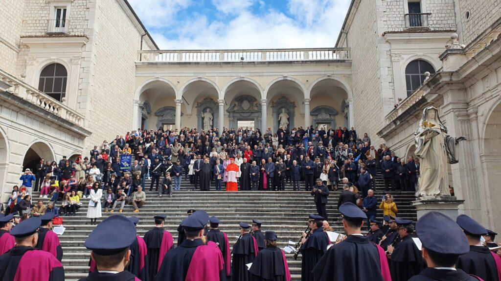 All'inizio della Celebrazione Eucaristica, iniziata in perfetto orario, l'Abate Luca ha rivolto un saluto ai presenti ed ha evidenziato: "L’antico ingresso della nostra abbazia reca sopra di sé la grande scritta Pax, anche a ricordare che chi attraversa quella porta entra in un luogo di pace. Sia perché cerchiamo di vivere qui la pace, sia perché vogliamo da questo luogo pregare per la pace. Anche l’invocazione per la pace, in questi tempi così tribolati che attraversiamo, vuole oggi nutrire la nostra preghiera e la nostra intercessione. San Benedetto chiede di non dare pace falsa. È uno degli strumenti delle buone opere del capitolo quarto. Non dare pace falsa. E subito prima gli altri strumenti ci richiamano a un impegno personale di conversione: non seguire l’impulso dell’ira; non serbare rancore; non tenere inganno nel cuore. Per pregare per la pace abbiamo tutti bisogno di imparare da san Benedetto a vegliare sulla verità del nostro cuore, prima ancora che sulle nostre labbra e sulle nostre azioni."