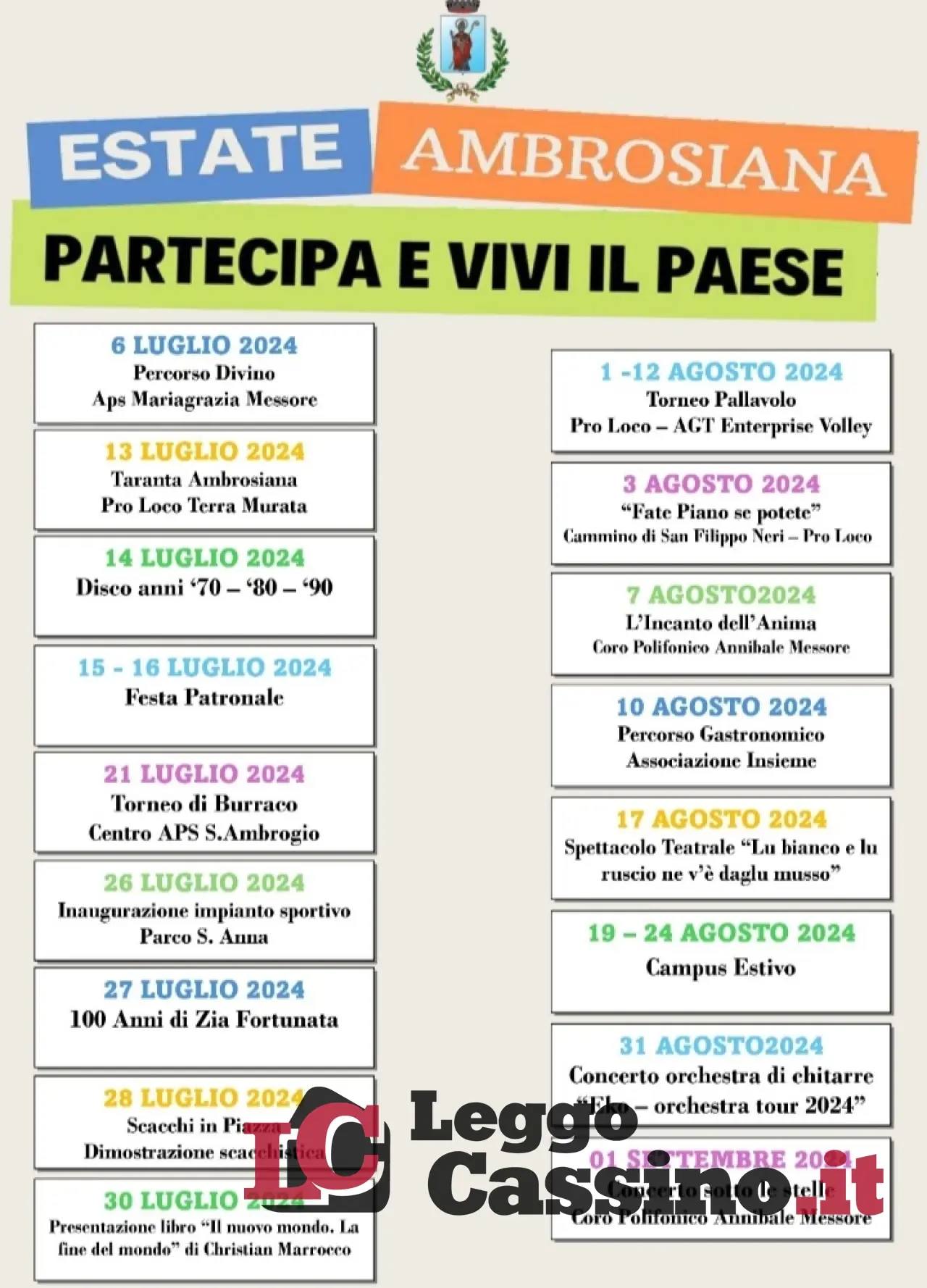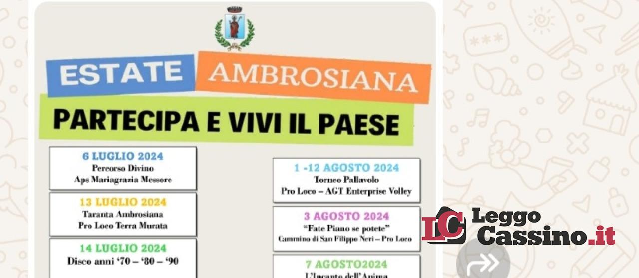 E’ iniziato l’attesissimo appuntamento dell’Estate Ambrosiana. Ecco il nutrito programma. Dopo il primo appuntamento del 6 luglio scorso con il “Percorso divino” APS Maria Grazia Messore, si continua nel comune di Sant’Ambrogio sul Garigliano il 13 luglio con lo spettacolo “Taranta Ambrosiana” Pro Loco Terra Murata.