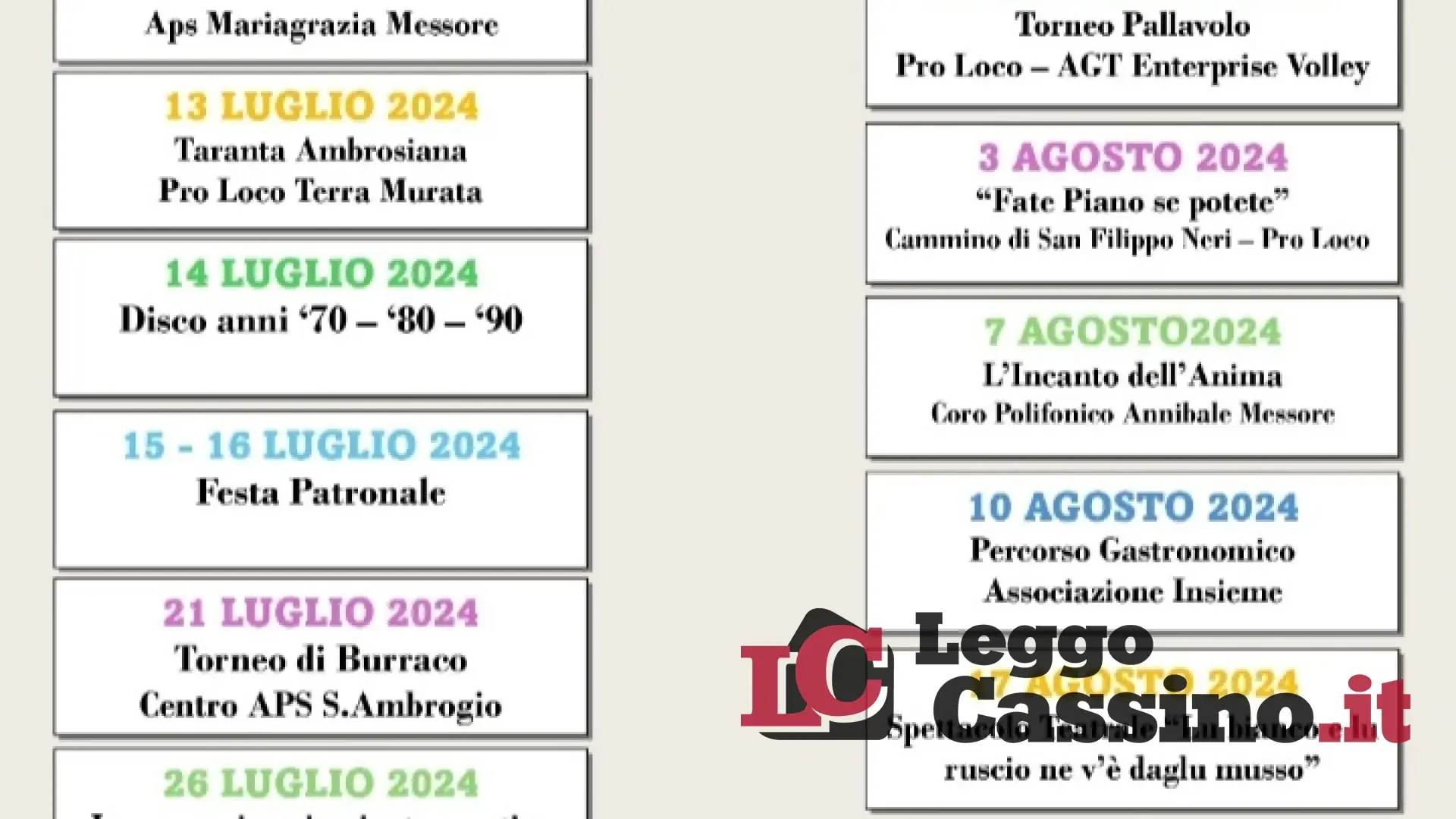 Dal 1° al 12 agosto si terrà il Torneo di Pallavolo Pro Loco – AGT Enterprise Volley. Il 3 agosto “Fate piano se potete” Cammino di San Filippo Neri – Pro Loco. Il 7 agosto “L’incanto dell’anima” Coro Polifonico Annibale Messore. Il 10 agosto Percorso Gastronomico con l’Associazione Insieme. Il 17 agosto lo spettacolo teatrale “Lu bianco e lu ruscio ne v’è daglu musso”. Dal 19 al 24 agosto si terrà il Campo Estivo. Il 31 agosto il Concerto Orchestra di Chitarre “Eko – orchestra tour 2024”. Il 1° settembre il Concerto Sotto le Stelle del Coro Polifonico Annibale Messore.
