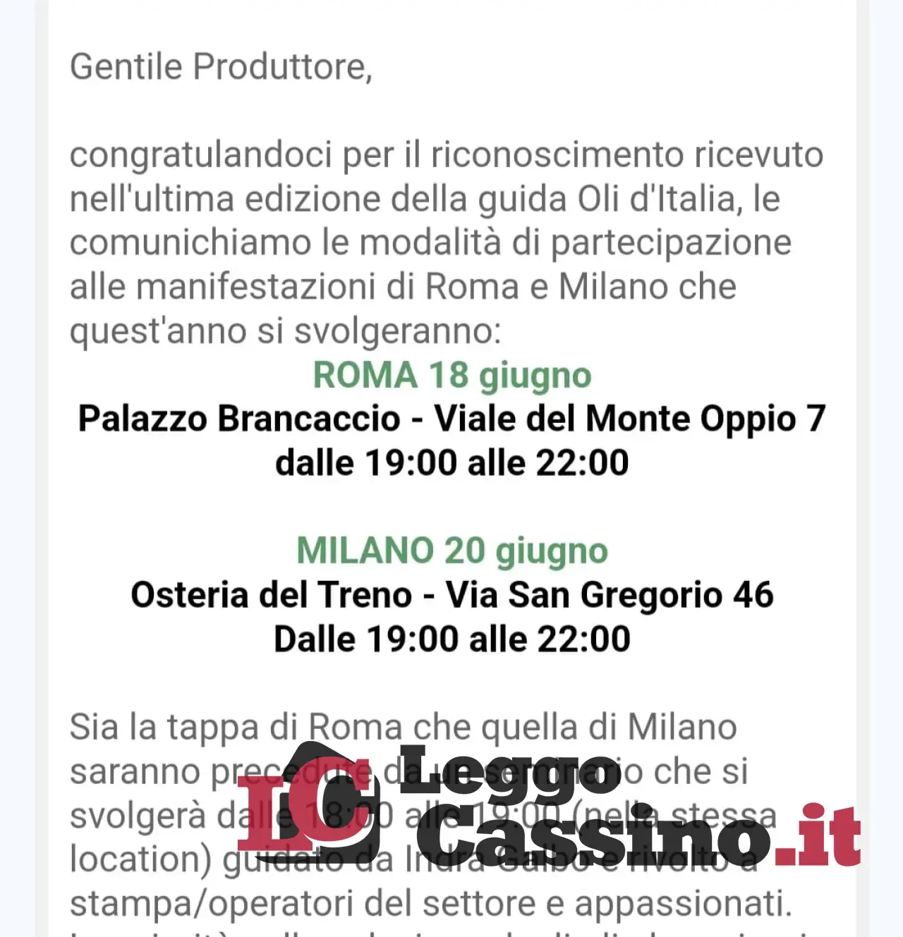 “Gambero Rosso – ha spiegato con molto orgoglio Ernesto Di Muccio titolare dell’azienda di famiglia - oltre a farci una lettera ufficiale di congratulazioni per il massimo riconoscimento ottenuto per il nostro olio evo Licinius Aurum, ci ha invitati a partecipare al tour delle città italiane”.