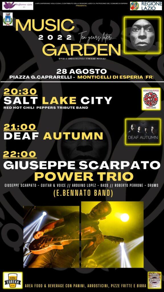 Come è accaduto per le precedenti edizioni, anche per questa il “Music garden” sorprende con grandi nomi del panorama musicale. Anche quest’anno, infatti, porta sul suo palco un big della chitarra con il suo power trio: Giuseppe Scarpato, chitarrista di Edoardo Bennato che sarà accompagnato dal bassista Arduino Lopez e dal batterista Roberto Perrone entrambi della band di Bennato.