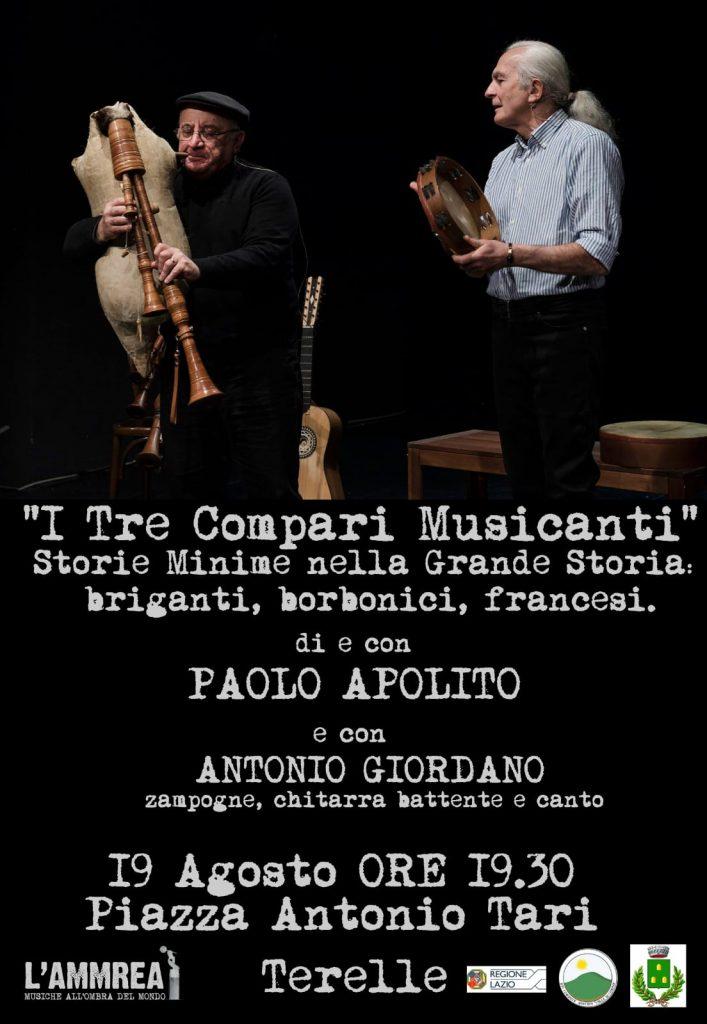 Giovedì 19 agosto aprirà la rassegna alle 19.30 in piazza Antonio Tari, davanti al municipio storico e con le montagne e la Chiesa principale a fare da cornice, il professor Paolo Apolito, l’ “antropologo a domicilio” che, dopo la sua brillante carriera di docente universitario, gira i festival dell’Italia in veste di cantastorie e divulgatore. Accompagnato dal musicista Antonio Giordano (voce, zampogna e chitarra battente) porterà in scena il monologo “Tre compari musicanti. Storie minime nella grande storia: briganti, borbonici, francesi”.