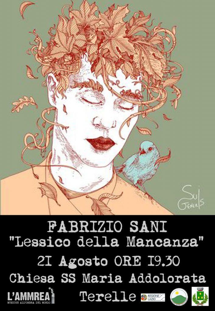 Sabato 2 agosto L’Ammrea ritroverà la sua formula originaria, quella del reading musicato, dalle ore 19.30 nella terrazza di Santissima Maria Addolorata. Sarà protagonista il pluripremiato poeta toscano Fabrizio Sani, tradotto anche all’estero con la raccolta Si innamoravano tutti di me e io del loro amore (Edizioni Sui generis). A Terelle presenterà una performance composta dalla lettura di poesie e di testi suoi e inediti e di autori come Kafka e Fante accompagnato dalle note del chitarrista Marco Nardone in una ricerca e una riflessione sul “Lessico della mancanza”.