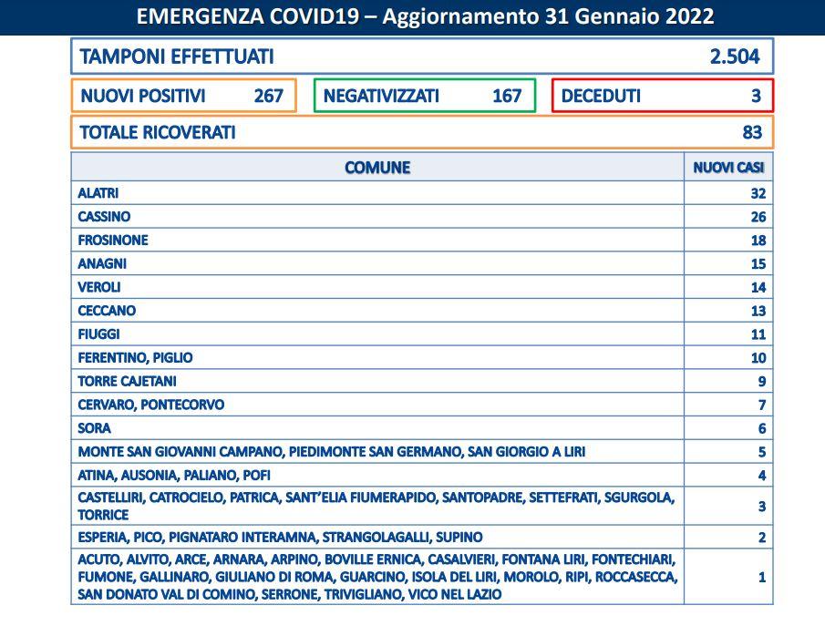Oggi, come ogni lunedì (dati riferiti alla domenica) sono nettamente inferiori ai giorni feriali i tamponi processati. Si registrano infatti "solo" 267 nuovi positive e ancora tre morti: una donna di 89 anni residente a Vallerotonda, una donna di 84 anni residente a Monte San Giovanni Campano e una donna di 76 anni residente a Fiuggi tutte con pregresse patologie. Si arriva dunque a 42 decessi registrati in provincia di Frosinone nel primo mese del 2022: un gennaio da dimenticare.