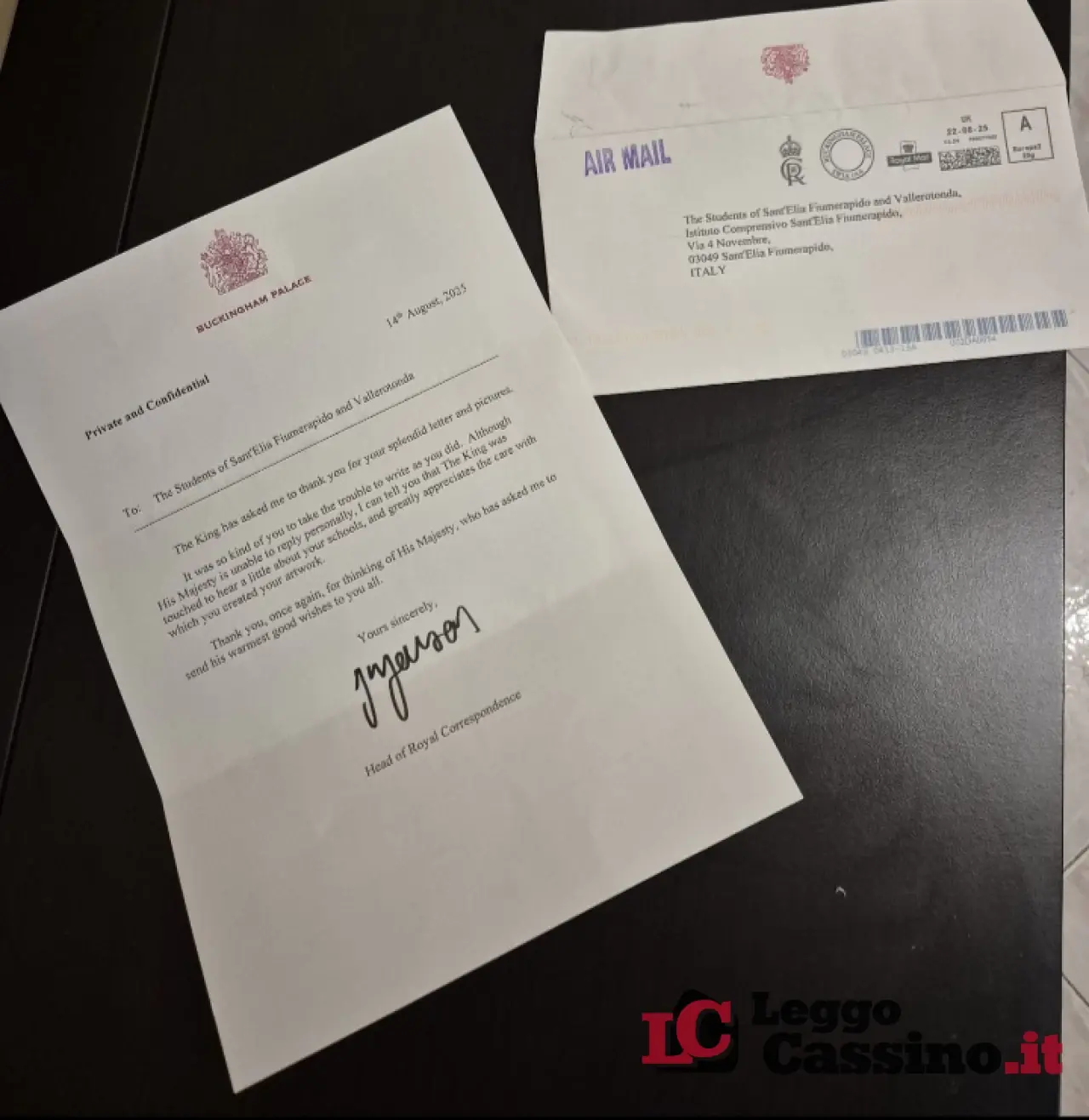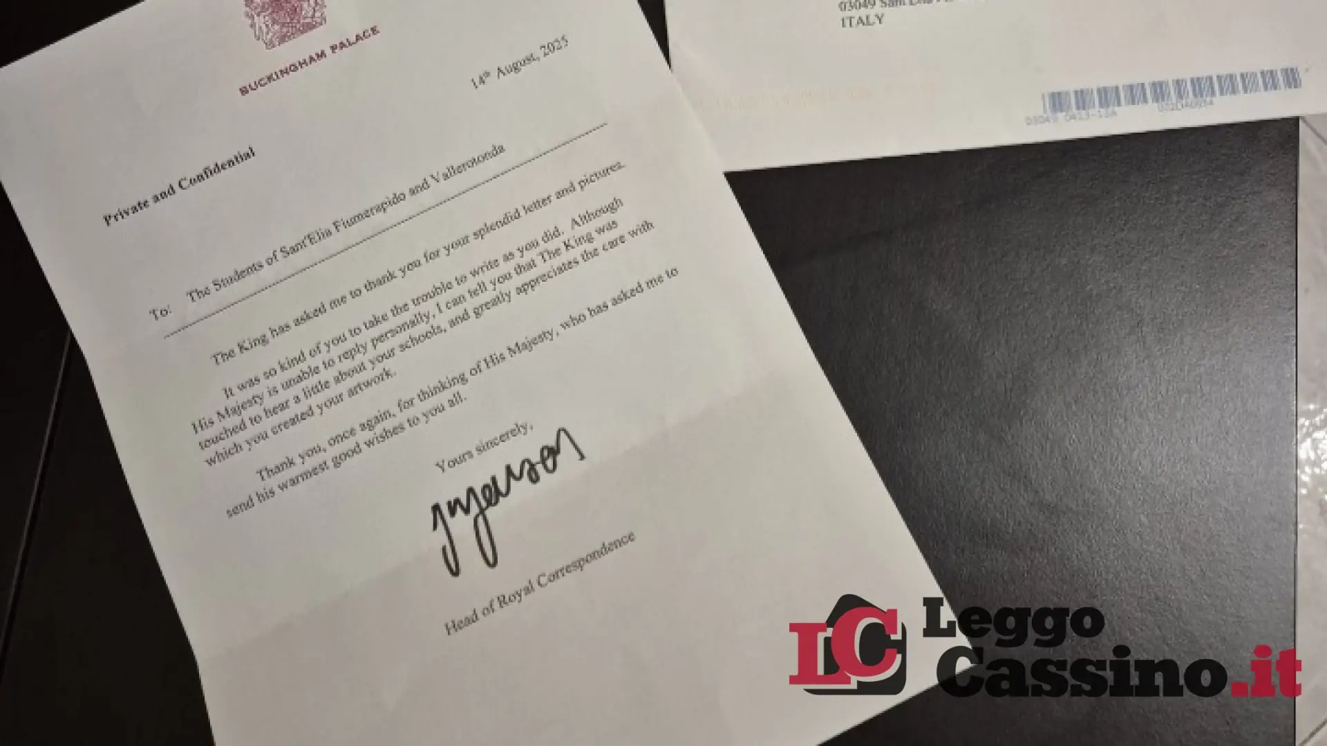 All’interno della busta, la lettera firmata dal Capo della Corrispondenza Reale inglese, che ha ringraziato gli studenti per la loro splendida lettera e per la cura dedicata ai disegni allegati, definiti “artwork”, vere e proprie “opere d’arte”, “molto apprezzati” da Re Carlo.