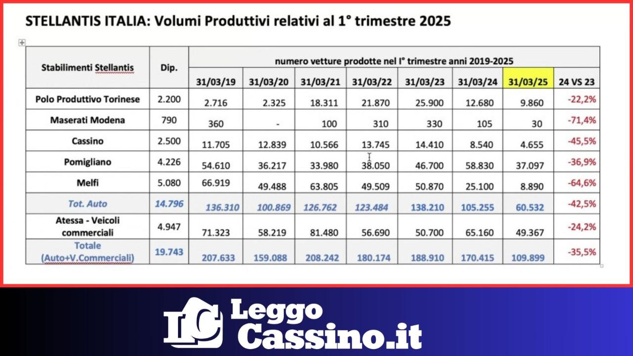 Economia - La Fim-Cisl presenta il report e lancia un grido d'allarme: "Il -45,5% evidenzia una situazione particolarmente critica per il sito produttivo con appena 4.555 vetture sfornate. Per tutto il 2025 continuerà ad esserci difficoltà sui volumi. Un dato trimestrale così negativo non è mai stato raggiunto nella storia dello stabilimento"