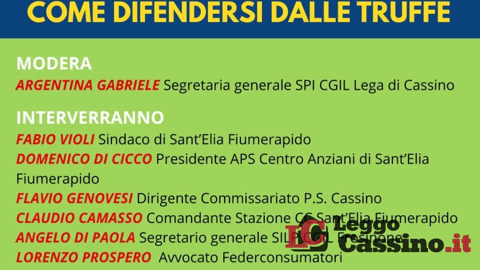 L'iniziativa vedrà la moderazione di Argentina Gabriele, Segretaria generale SPI CGIL Lega di Cassino, e l'intervento di numerosi relatori: Fabio Violi, Sindaco di Sant'Elia Fiumerapido; Domenico Di Cicco, Presidente APS Centro Anziani di Sant'Elia Fiumerapido; Flavio Genovesi, Dirigente Commissariato P.S. Cassino; Claudio Camasso, Comandante Stazione CC Sant'Elia Fiumerapido; Angelo Di Paola, Segretario generale SILP CGIL Frosinone; Lorenzo Prospero, Avvocato Federconsumatori; Fabrizio Marandola, Segretario SPI CGIL Lega di Cassino - Resp. Sportello Sociale e Beatrice Moretti, Segretaria generale SPI CGIL Frosinone Latina.