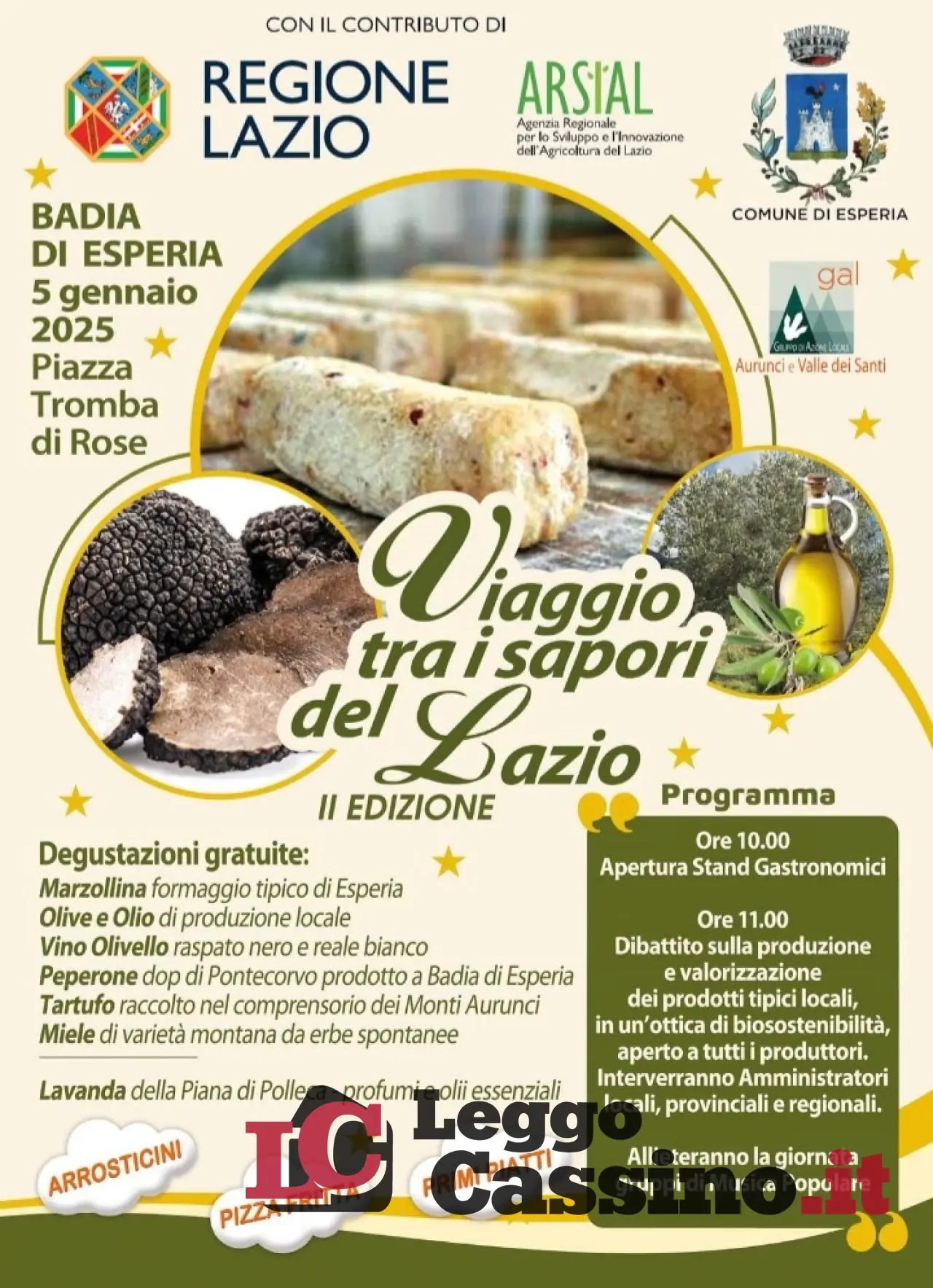 Al via “Viaggio tra i Sapori del Lazio”. L’evento giunto alla seconda edizione si terrà a Badia di Esperia, domani 5 gennaio, in piazza Tromba di Rose. Con il contributo della Regione Lazio, Arsial (Agenzia Regionale per lo Sviluppo e l’Innovazione dell’Agricoltura del Lazio), del Comune di Esperia.