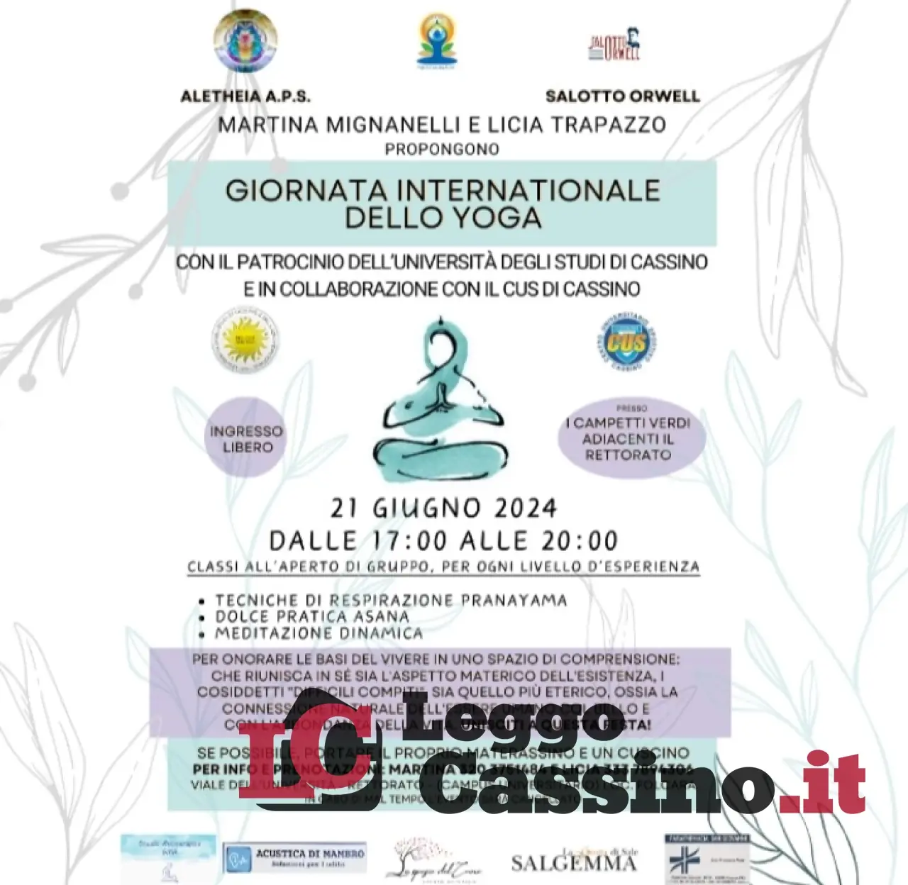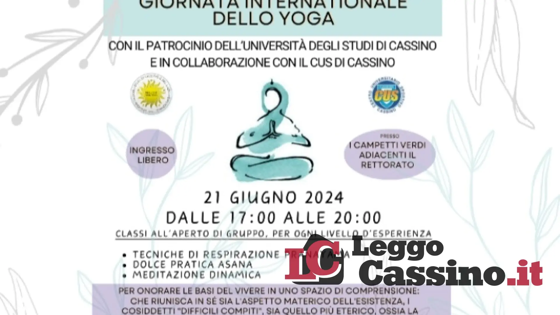 La giornata internazionale dello yoga, istituita ufficialmente dall’ONU nel 2014 sarà celebrata quest’anno anche a Cassino. Grazie all’iniziativa delle insegnanti di yoga certificate, Martina Mignanelli e Lucia Trapazzo e alla disponibilità del CUS Cassino che ha messo a disposizione i campi del Campus della Folcara, venerdì 21 giugno, a partire dalle ore 17,00 fino alle ore 20,00, chiunque vorrà potrà sperimentare gratuitamente l’esperienza dello yoga. Proprio nel giorno del solstizio d’estate, il giorno più lungo dell’anno, in cui si può godere del picco massimo di luce, si potrà provare l’esperienza dello yoga.