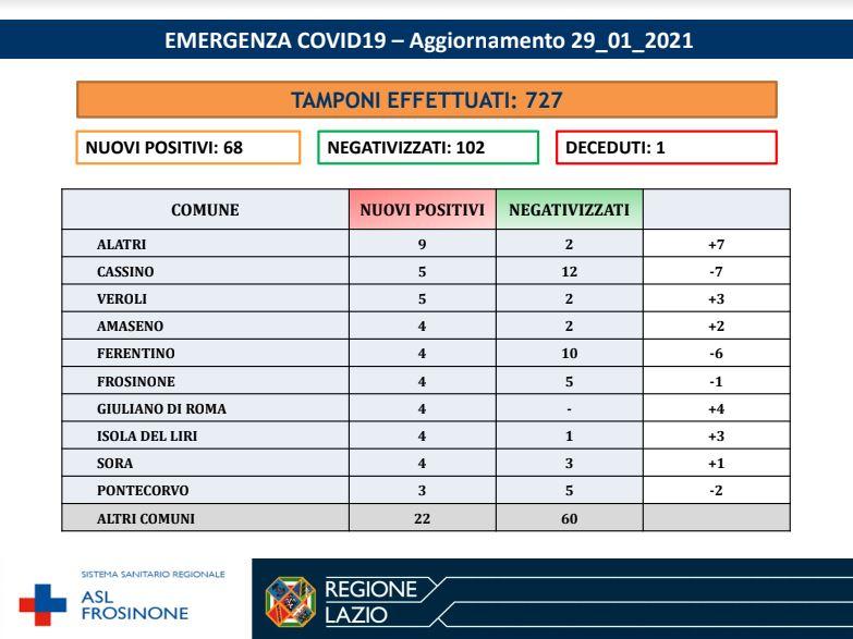 E intanto a proposito di numeri, poco fa è stato reso noto il bollettino della Asl di Frosinone: oggi risultano essere 68 i positivi su 727 tamponi, ovvero meno del 10%. Oltre cento i guariti. Sono stati registrati due decessi nelle ultime 24 ore: uno residente in Provincia di Frosinone e uno residente in Provincia di Latina: un uomo di 74 anni residente ad Arce e una donna di 91 anni residente a Formia.