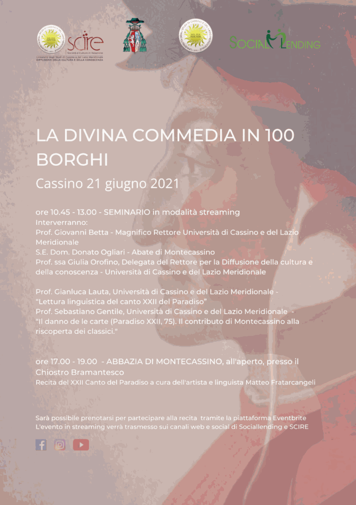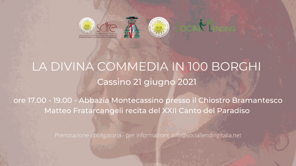 La conferenza della mattina potrà essere seguita in streaming sul canale YouTube Sociallending e sulle pagine Facebook Sociallending e SCIRE. Per la recita del Canto del Paradiso presso l’Abbazia è necessario prenotarsi al link: https://www.eventbrite.it/e/biglietti-la-divina-commedia-in-100-borghi-canto-xxii-par-cassino158767663355 Per maggiori informazioni e dettagli sulla giornata è possibile scrivere a info@sociallendingitalia.net.