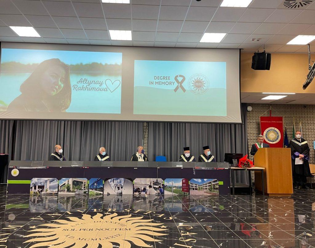 Questa mattina in una emozionante cerimonia emozionante il Magnifico Rettore Marco Dell’Isola ha consegnato la Laurea alla Memoria, “sicuro che Altynay avrebbe portato a termine il corso di studi” Grazie all’università di Cassino per questo gesto bellissimo, agli studenti di Primavera Studentesca ed al sindaco Enzo Salera".