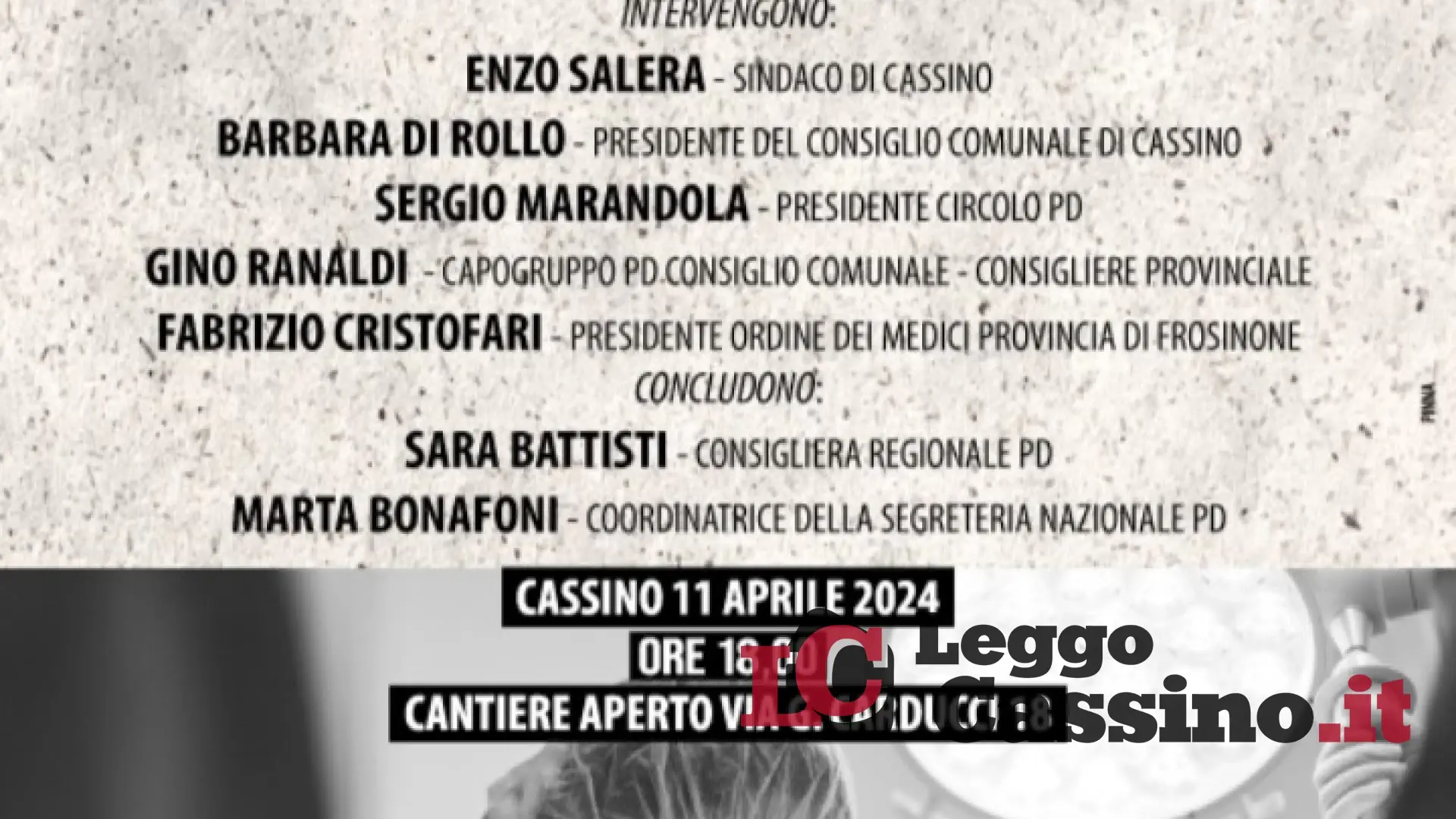 Introduce Luca Fantini Segretario Provinciale PD; coordina Romeo Fionda Segretario Circolo PD. Intervengono: Enzo Salera sindaco di Cassino; Barbara Di Rollo Presidente del Consiglio Comunale di Cassino; Sergio Marandola Presidente Circolo PD; Sergio Marandola Presidente Circolo PD; Gino Ranaldi Capogruppo PD Consiglio Comunale – Consiglio Provinciale; Fabrizio Cristofari Presidente Ordine dei Medici Provincia di Frosinone. Concludono: Sara Battisti Consigliera Regionale PD, Marta Bonafoni Coordinatrice della Segreteria Nazionale PD.