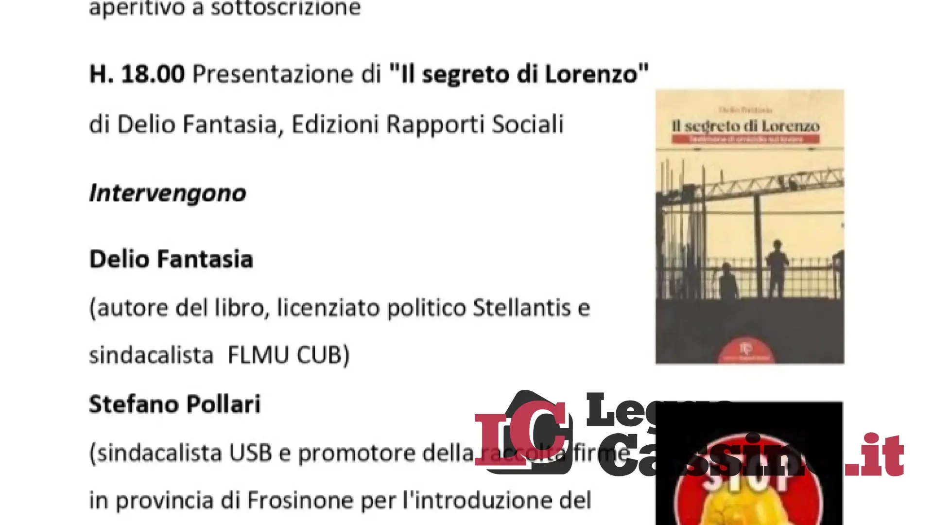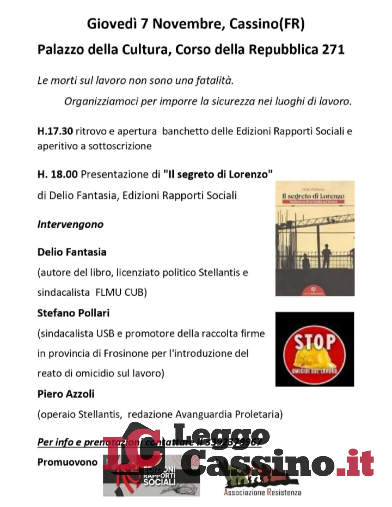 “Un volume che narra di una storia vera di omicidio sul lavoro – spiega l’autore Delio Fantasia - e parla a tutti noi, di sicurezza sul lavoro come diritto inalienabile di chi lavora. Della necessità della denuncia foss'anche in forma anonima e di una resistenza operaia che non può che continuare. Un confronto che metterà insieme diverse realtà, provenienze ed esperienze. Una cosa bella e utile, perché l'assemblea ha rilanciato l’idea di costruire un lavoro comune, ordinario e di coordinamento sul territorio, che metta al centro l'unità di classe e la forza del protagonismo operaio e dei lavoratori. Un'iniziativa, così, al servizio della lotta di classe. Non solo così per dire”.