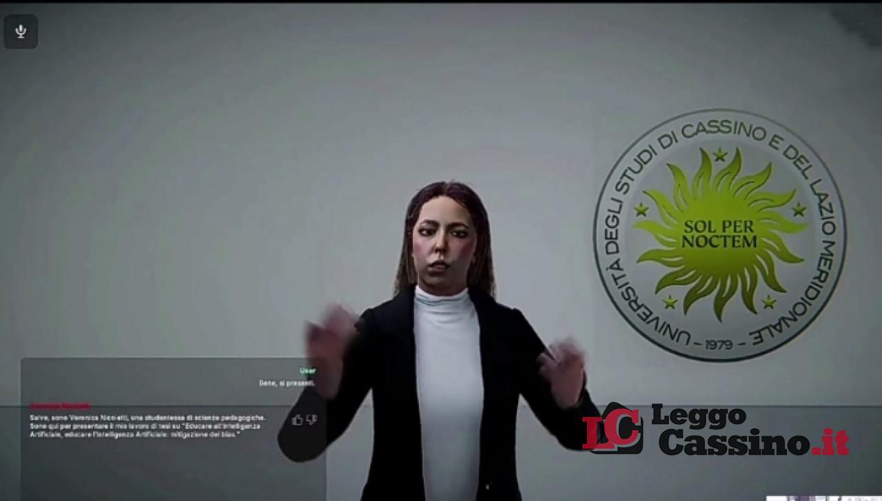 A Cassino, per la prima volta, una tesi di laurea è stata discussa da un’intelligenza artificiale. Protagonista è stata Veronica Nicoletti, che ha conseguito la laurea magistrale in Scienze dell’Educazione presso l’Università degli Studi di Cassino e del Lazio Meridionale, dove grazie a un’innovativa modalità di presentazione, a discutere la tesi, non è stata la studentessa in carne e ossa, ma un suo avatar digitale guidato da un sistema di intelligenza artificiale avanzato.