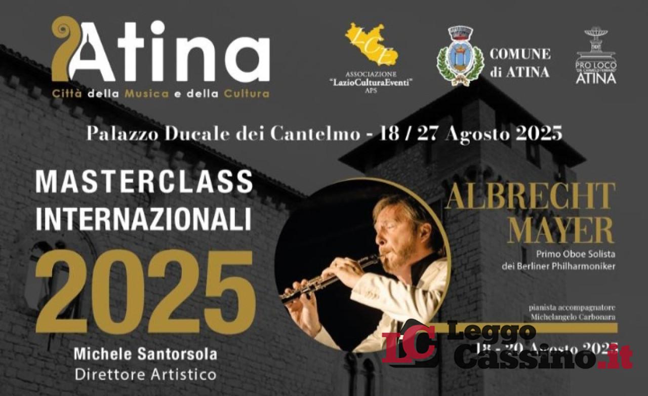 Le Masterclass di Atina 2025 sono un progetto organizzato dall'Associazione "LazioCulturaEventi" LCE - APS, in collaborazione con il Comune di Atina e la Pro Loco della stessa città. Un evento che unisce passione, formazione e spettacolo, con l’obiettivo di promuovere la cultura musicale e offrire un’opportunità unica ai giovani musicisti di perfezionarsi sotto la guida di grandi maestri internazionali.