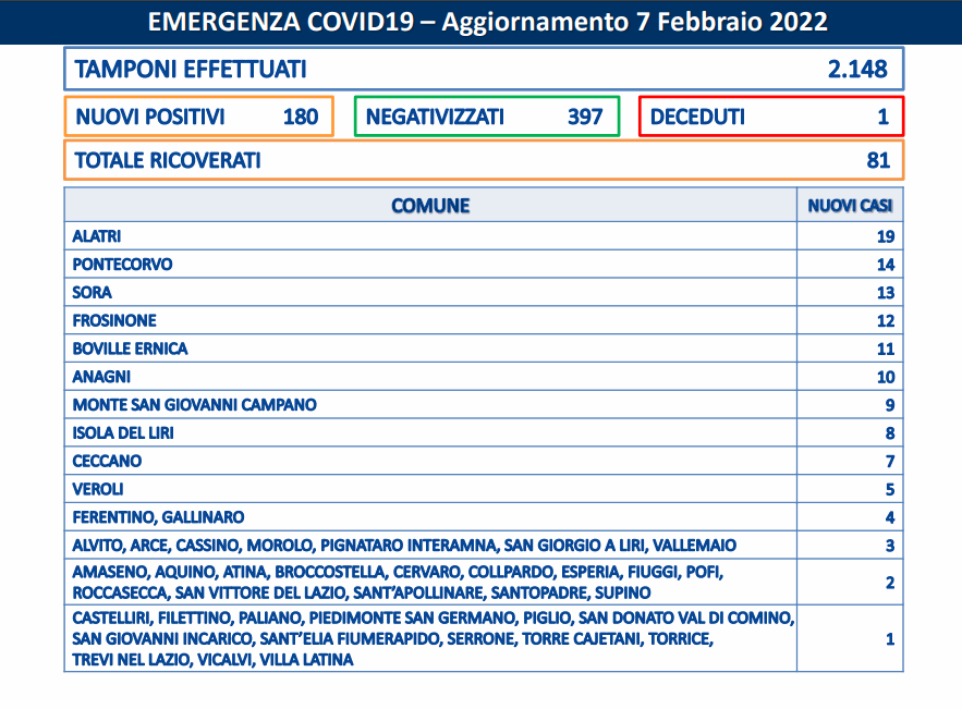 Come ogni lunedì (dati riferiti alla domenica) è in calo il numero dei tamponi anti Covid: mediamente si registrano 8.000 test, oggi sono appena il 25%. Su poco più di duemila tamponi effettuati i nuovi casi sono 180, la metà rispetto ai guarito che sfiorano quota 400. Stabile a 81 il numero dei ricoverati mente non si arresta la scia dei morti. Ancora oggi, infatti, in provincia di Frosinone è stato registrato un decesso: un uomo di 71 anni residente ad Anagni con pregresse patologie.