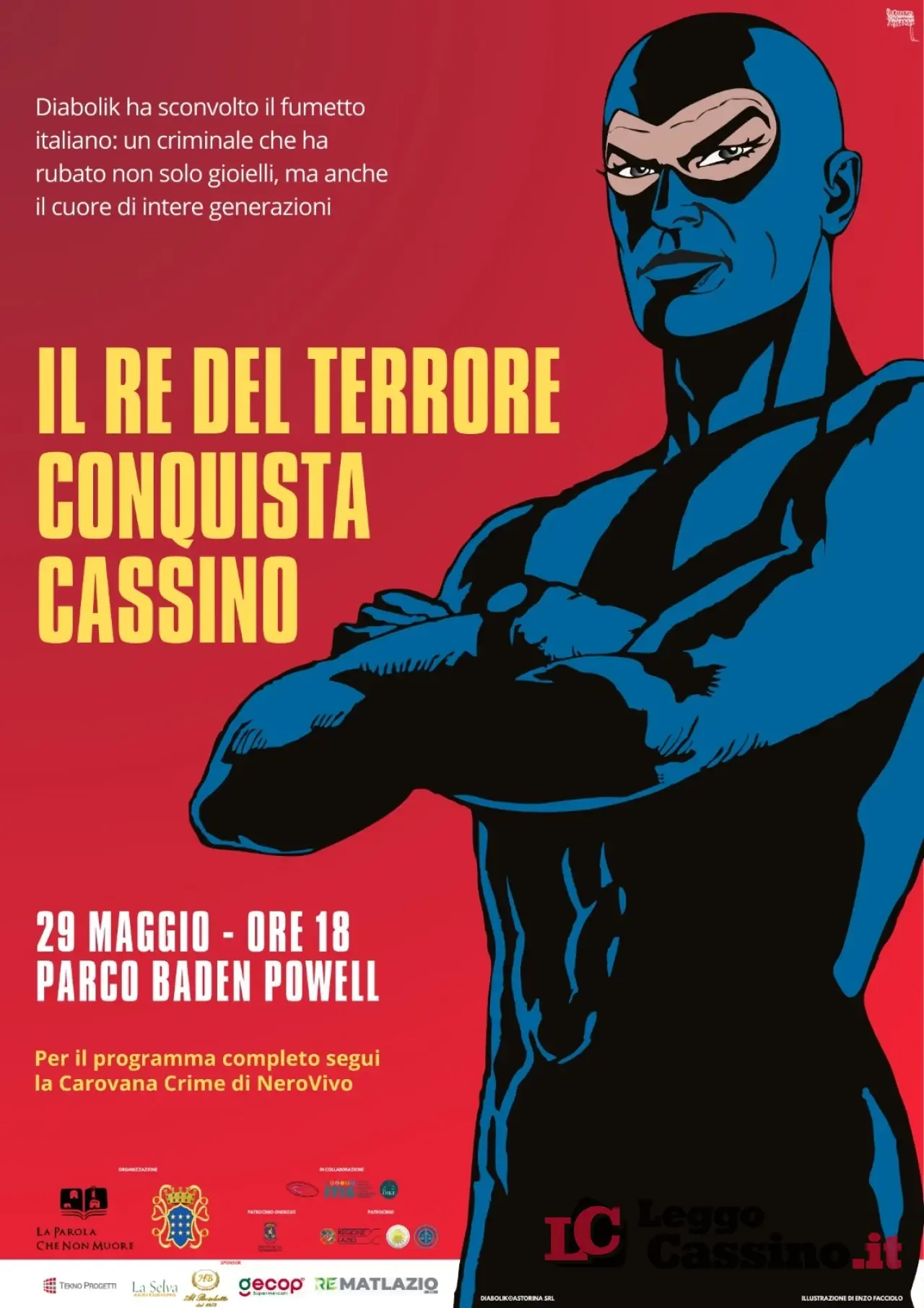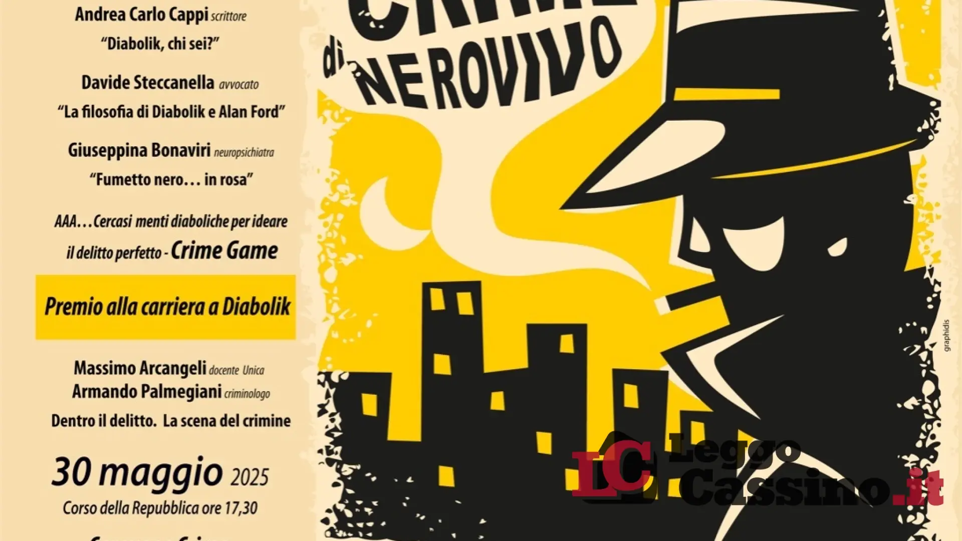 Due giorni di cronaca nera, street talk e il premio alla carriera per Diabolik Due giorni di street talk rapidi, incisivi, interattivi. Approfondimenti tematici su cronaca e attualità, una scena del crimine riprodotta fedelmente e basata su documenti inediti. NeroVivo Festival avrà la sua anteprima estiva a Cassino, il 29 maggio 2025 al Parco Baden Powell ed il 30 maggio sul Corso della Repubblica attraverso la Carovana Crime. Destinazione finale: il chiostro del Palagio Badiale.