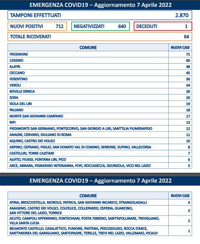 Quasi tremila tamponi e oltre settecento positivi: numeri ancora alti quelli registrati nelle ultime 24 ore in provincia di Frosinone per quel che riguarda i contagi Covid. I guariti sono 640, salgono da 62 a 64 i ricoverati. Si registra ancora un decesso: una donna di 90 anni residente a Castro dei Volsci con pregresse patologie.