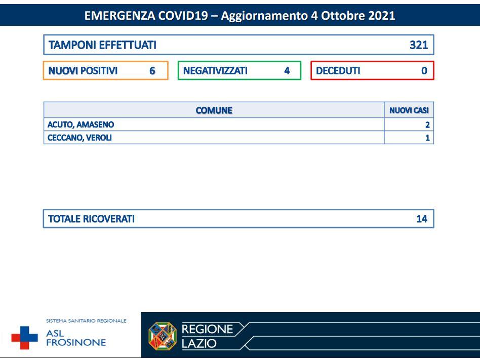 Nelle ultime 24 ore sono stati effettuati 321 tamponi in provincia di Frosinone. Si registrano 6 nuovi casi di positivi al SARS-CoV-2. I negativizzati sono 4 e i ricoverati 14. Non si registrano decessi. Nel Lazio su 8.825 tamponi molecolari e 4.528 tamponi antigenici per un totale di 13.353 tamponi, si registrano 240 nuovi casi positivi (-38), 3 i decessi ( = ), 365 i ricoverati (+11), 57 le terapie intensive (+1) e 364 i guariti. Il rapporto tra positivi e tamponi è all’1,7%. I casi a Roma città sono a quota 132”.