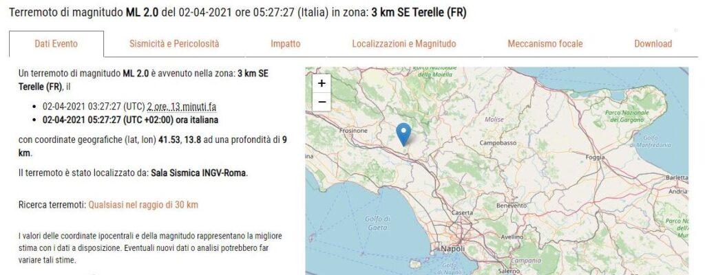 Un epicentro di magnitudo 2.0 è stato avvertito questa mattina all'alba, ore 5.30 circa, nella città di Cassino e in alcuni centro del Cassinate. L'Ingv ha infatti localizzato l'epicentro nel comune di Terelle ad una profondità di 9 km. Una scossa che non ha provocato danni, data la bassa intensità, ma che ha provocato un brutto risveglio ai tanti cittadini di Cassino e di alcuni centri limitrofi che l'hanno ben avvertita, soprattutto ai piani alti degli appartamenti.